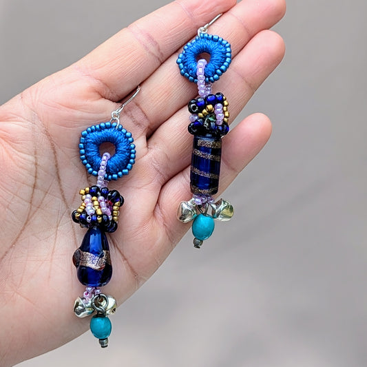 Asymmetric Blue & Silver Scrap Bead Statement Earrings | Mayaani Jewellery UK