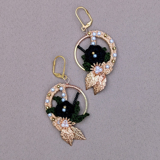 Aloki | Black Gold Hoop Floral Motif Indian Beaded Hoop Earrings